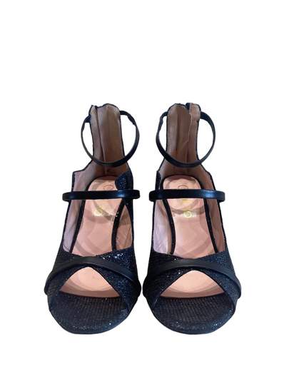 Decolletè in nappa e tessuto lurex, open toe, zip, tacco stiletto, interno in pelle e suola in cuoio- Moda: Donna