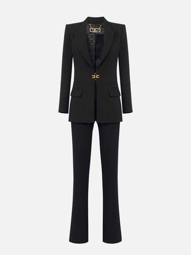 Tailleur in crêpe stretch composto da giacca con tasche a filetto e patta chiusa da placca logo in metallo dorato e pantalone palazzo con spacchi laterali.- Moda: Donna