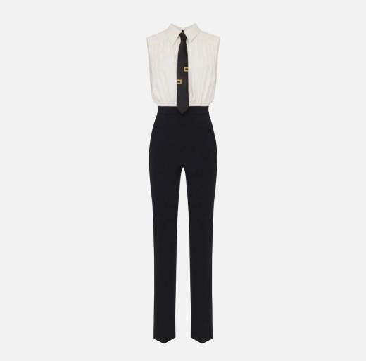 Tuta composta da camicia smanicata in georgette di viscosa e pantalone dritto in crêpe stretch. È caratterizzata da cravatta amovibile impreziosita da placche logo in metallo dorato.- Moda: Donna